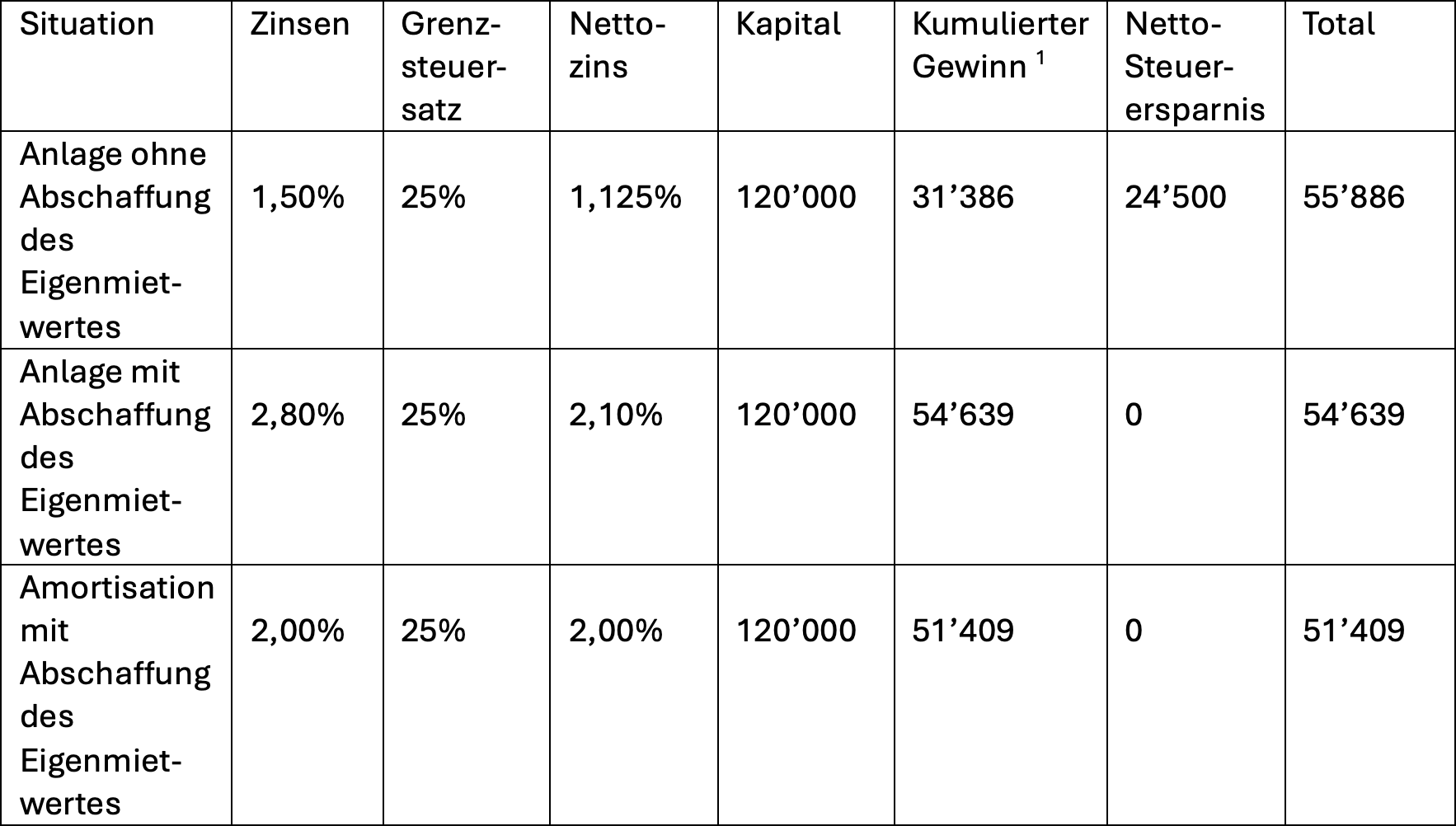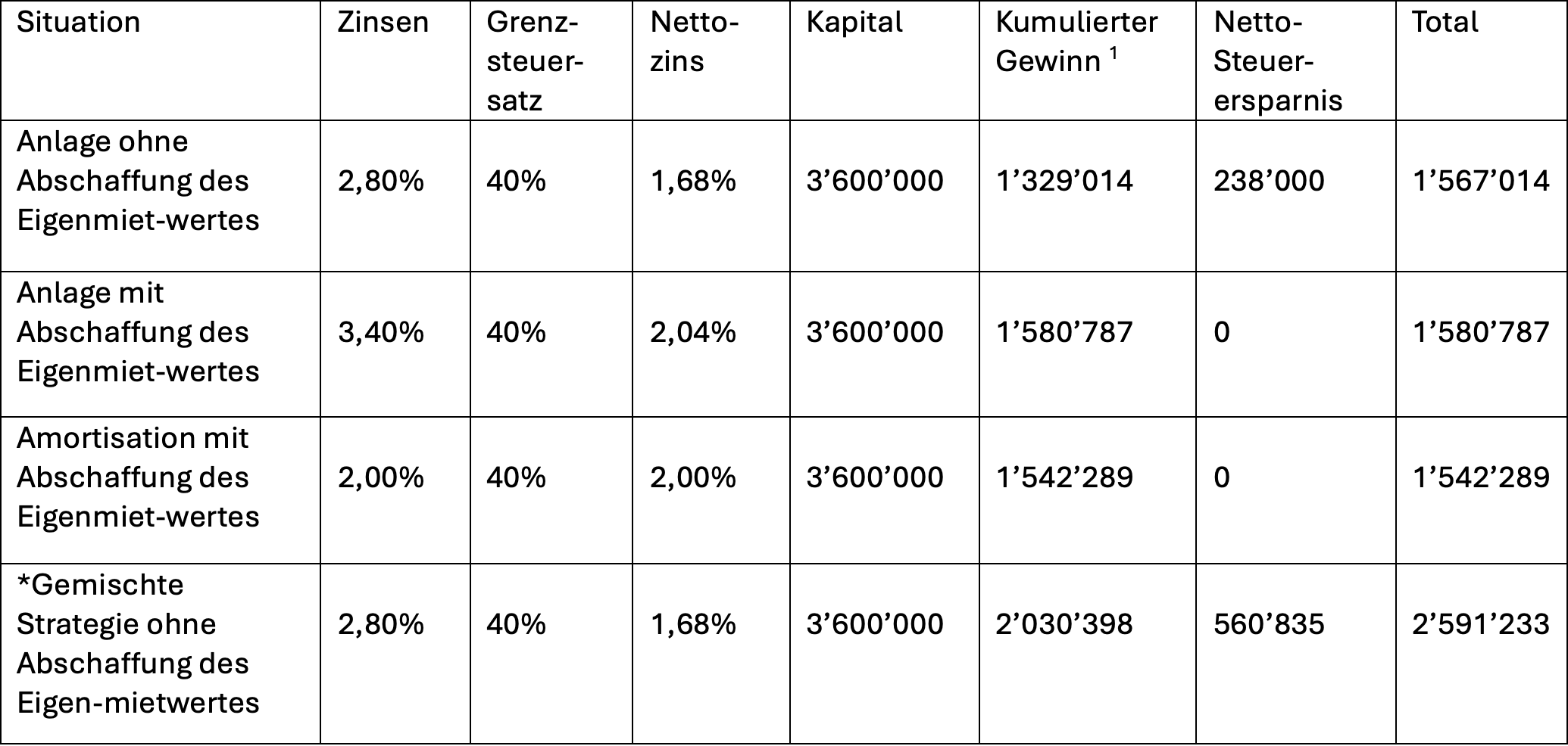 Steigen die Hypothekarzinsen auf 3%, vergrössert sich dieser Vorteil stark: In einem solchen Szenario wäre die Abschaffung des Eigenmietwertes deutlich weniger attraktiv, da bereits eine Rendite von 3% zu einem mehr als verdoppelten Ertrag gegenüber der Amortisationsvariante mit abgeschafftem Eigenmietwert führen würde (diese Annahme ist in folgender Tabelle nicht im Detail dargestellt), d. h. von CHF 87'000 auf CHF 180’000.