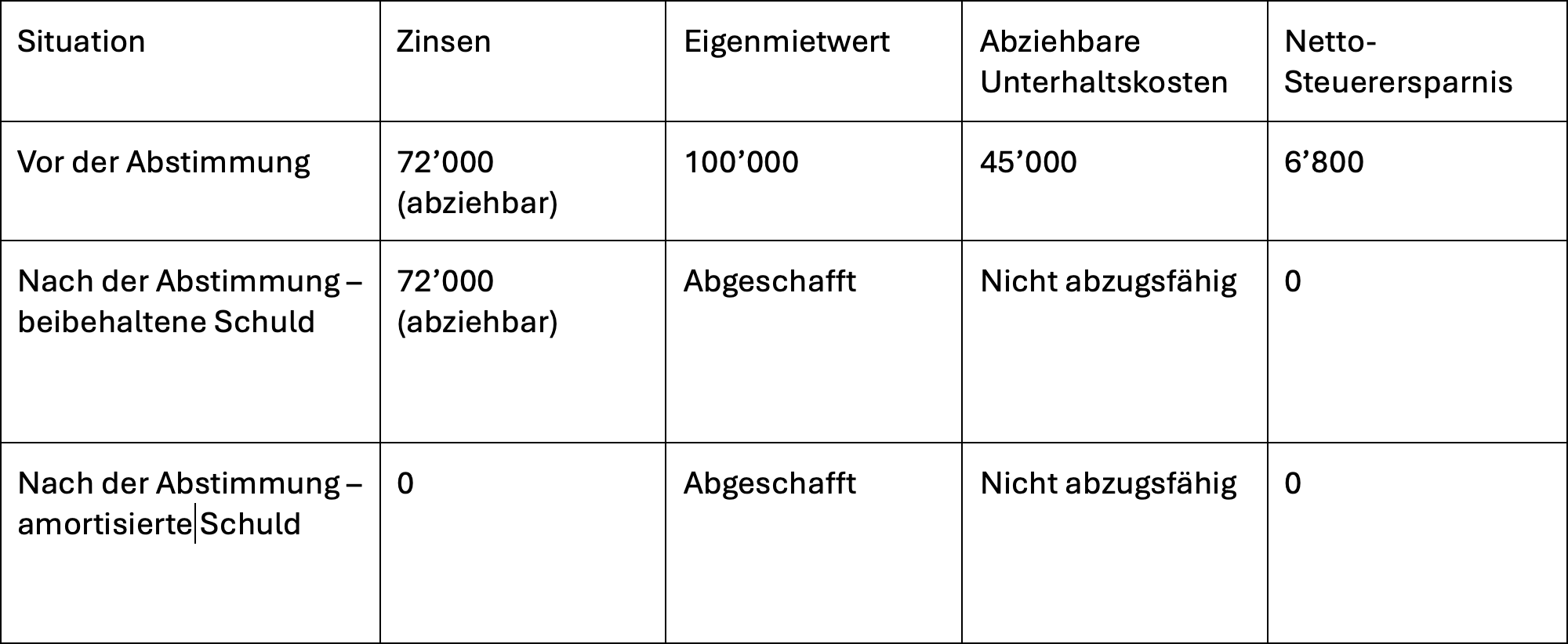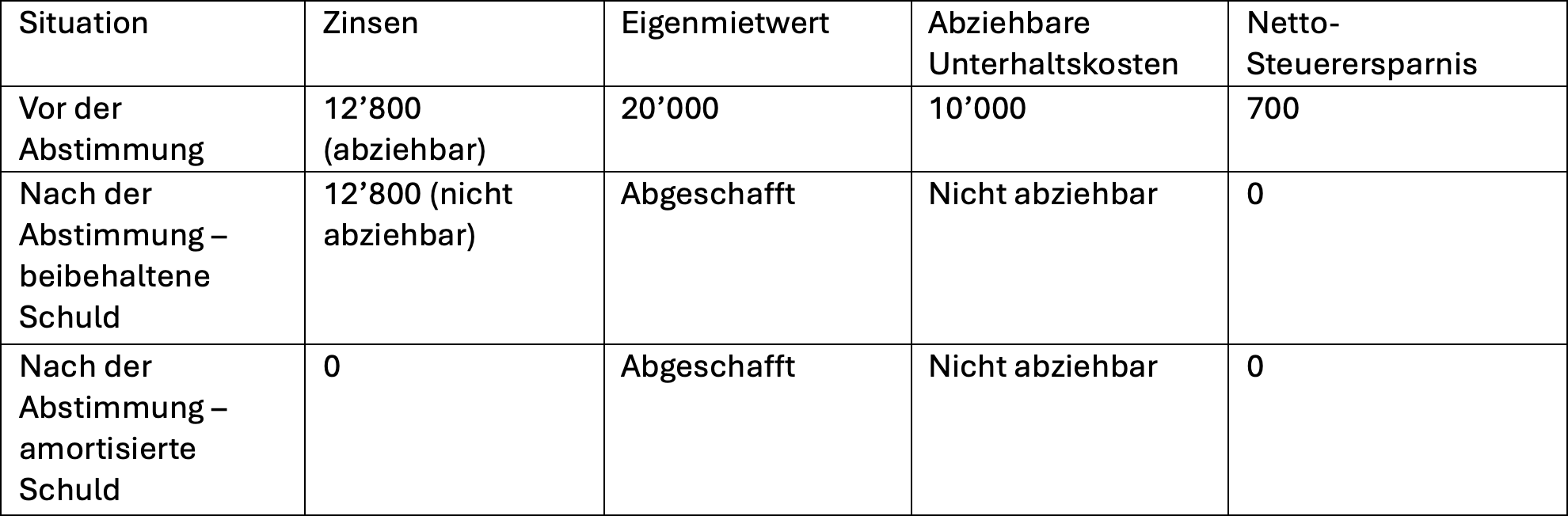 Steigen die Hypothekarzinsen auf 3%, verringert sich dieser Vorteil zusätzlich: In einem solchen Szenario wäre die Abschaffung des Eigenmietwertes deutlich weniger attraktiv, da bereits eine Rendite von 3,3% ausreichen würde, um die Amortisationsvariante mit abgeschafftem Eigenmietwert zu erreichen (diese Annahme ist in folgender Tabelle nicht im Detail dargestellt).